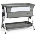 This all-in-one convenient playyard one of side opening as baby co-sleeper, that with changing table, musical mobile with delightful hanging toys, and smart diaper storage to keep essentials within reach. The sturdy construction supports up to 20-33pounds, making it perfect for growing infants and toddlers. The dark gray design offers a sleek, modern look that complements any room decor. The mobile entertains your little one with soothing music and colorful plush toys, while the mesh sides provide excellent ventilation and visibility. The changing station can be easily removed when not needed, A practical diaper storage system keeps essentials organized and within easy reach, featuring multiple compartments and mesh pockets. this playard features locked wheels for easy movement between rooms. The sturdy construction ensures stability during use, its clever folding mechanism allows for compact storage when not in use. Measuring 32 x 10.5 x 10.5 inches when assembled, The included mattress pad size 36.6 "x 24.8"provides a comfortable space for your baby to rest and play. Perfect for both home use and travel, this playard combines functionality with modern design to create an essential piece of baby gear for today's parents