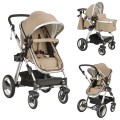 It can not only be considered as an infant bassinet, but also a toddler seat stroller. It features a wide seat base and multi-position recline seat. The heavy-duty aluminium alloy frame, wearable non-toxic linen, rubber wheels and 5 point safety harness give your baby more safety. It is equipped with stroller accessories like warm foot cover, cup holder, safe stroller wrist strap, baby seat cushion, mosquito net and baby bag. Reversible seat makes it easy for babies to face the parents or to face the world.