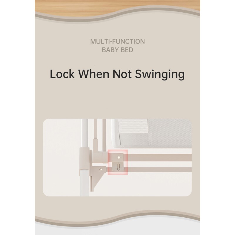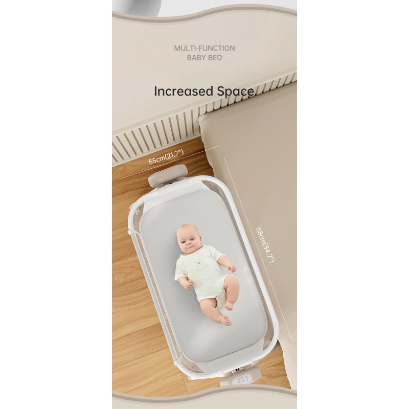 • Gentle Electric Rocking: The crib features five gentle rocking modes with dual controls (remote and panel). It also includes three timing options (5, 15, and 30 minutes) with auto-stop for added safety. The rocking function can be locked when not needed.